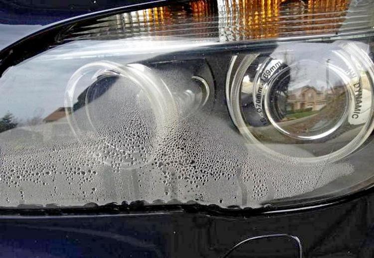Раньше фары были не глубокие, практически вертикальные. Сейчас же фара является так же и дизайнерским элементом и в большинстве своём имеет очень глубокую заострённую форму. А снизу имеет острую кромку с внутренней маской впритык подходящей к этой самой кромке — в этом случае обязательно в этом месте при переохлаждении покрывного стекла будет выпадать влага из воздуха поскольку какой либо конвекции в этом месте нет.